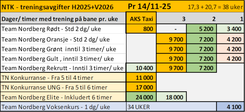 Treningsavgifter - priser høsten 2025 og våren 2026